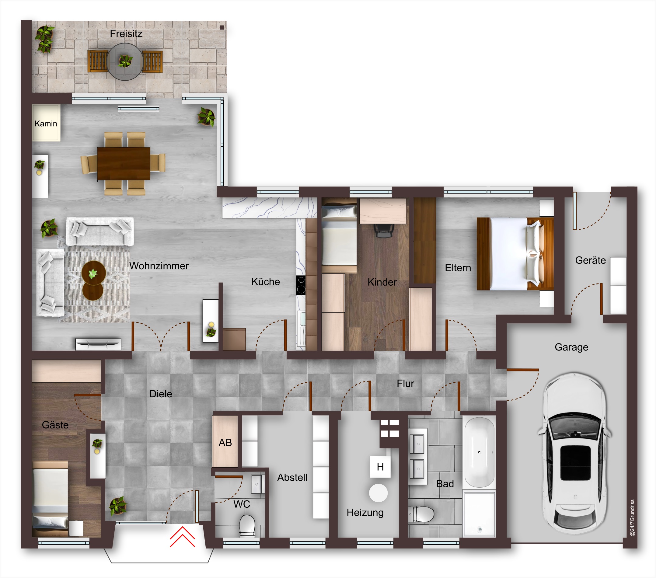 Zudem verfügt der Bungalow über ein modernes Badzimmer mit Doppelwaschbecken und bodentiefer Dusche, sowie ein praktisches Gäste-WC, das für zusätzlichen Komfort im Alltag sorgt.
