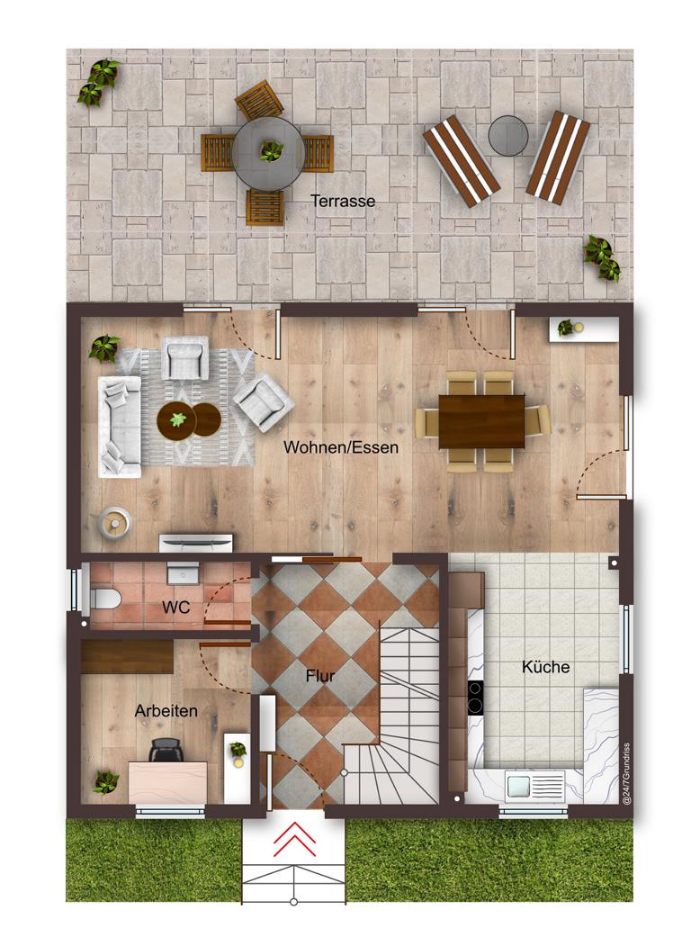 Das lichtdurchflutete Wohnzimmer mit direktem Zugang zur Terrasse und zum Garten wird schnell zum Lieblingsplatz der ganzen Familie. Hier können Sie entspannen, Gäste empfangen und die warme Atmosphäre genießen.