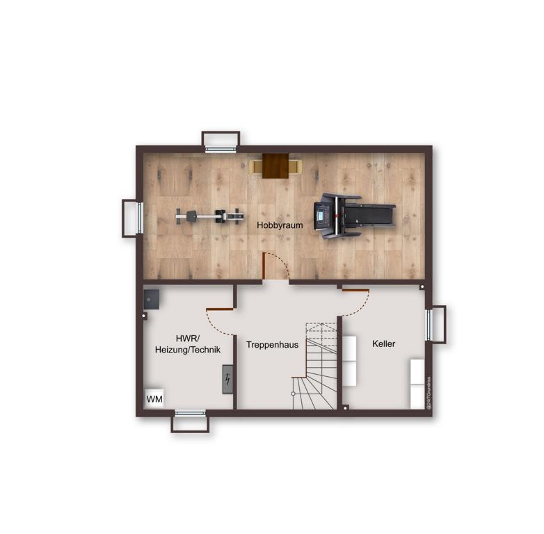Der Keller bietet zusätzlichen Raum für Ihre individuellen Bedürfnisse. Ein großzügiger Hobbyraum lädt dazu ein, kreative Projekte zu verwirklichen, oder sich einen persönlichen Fitnessbereich einzurichten. Ergänzt wird das Untergeschoss durch einen praktischen Kellerraum, der ausreichend Stauraum für Vorräte, Haushaltsgegenstände oder saisonale Dekoration bietet.