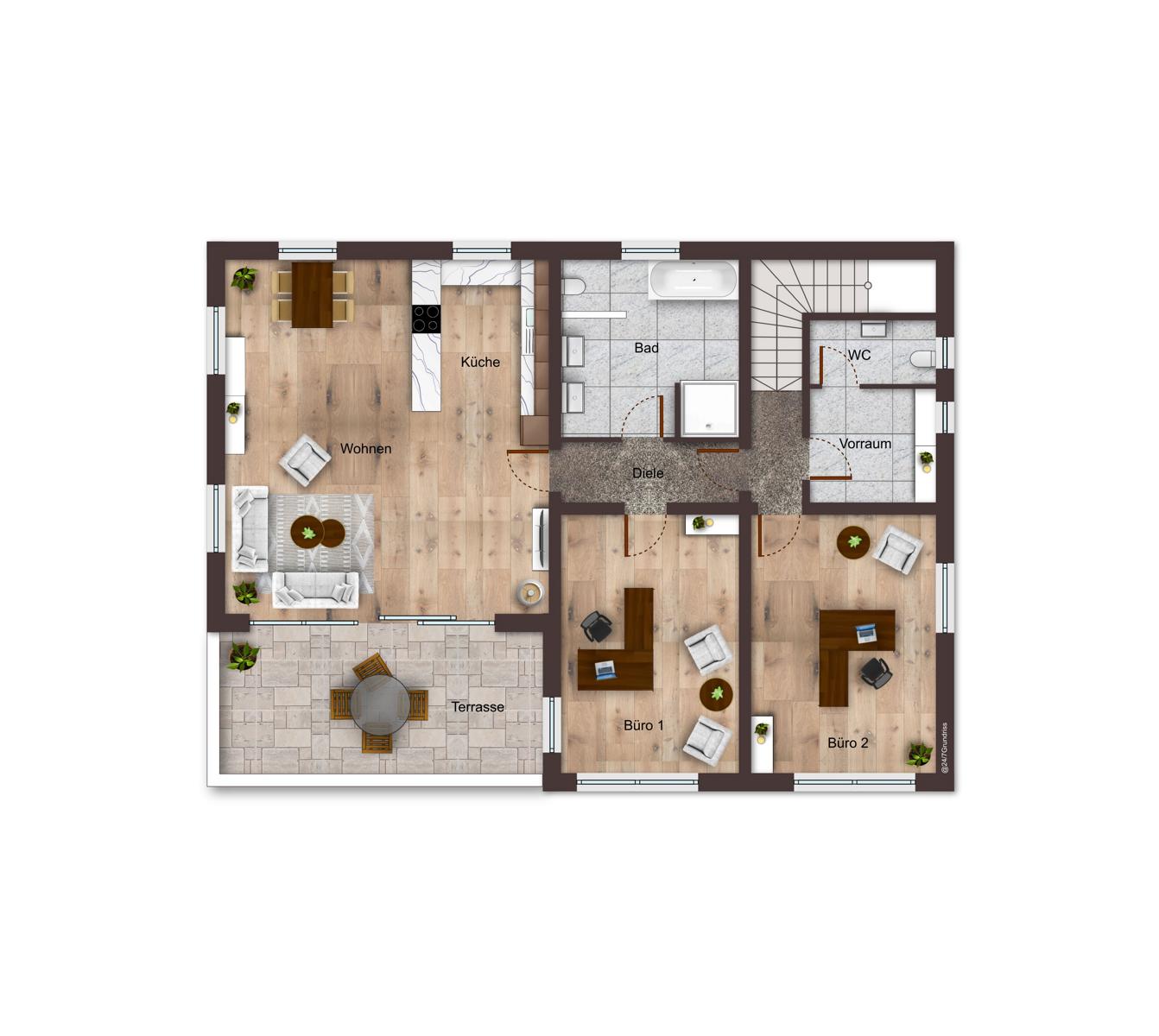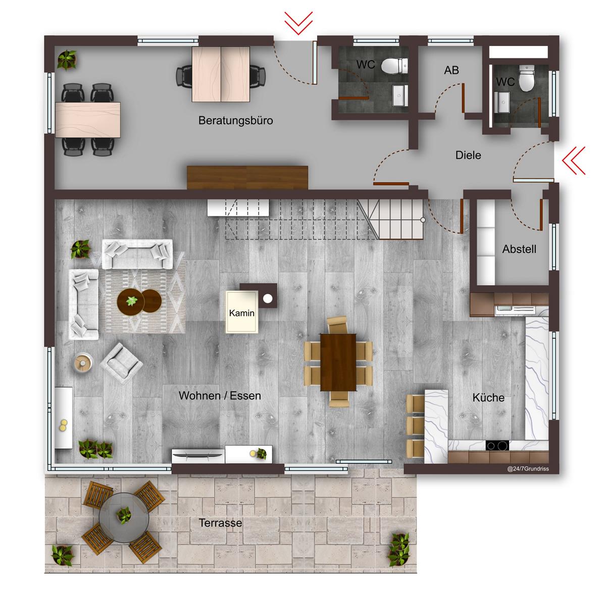 Musterhaus mit einer Nutzfläche von ca. 219,98 m², 2 Bäder und zwei zusätzliche WCs, Küche, Aufteilung in mehrere Büros möglich
